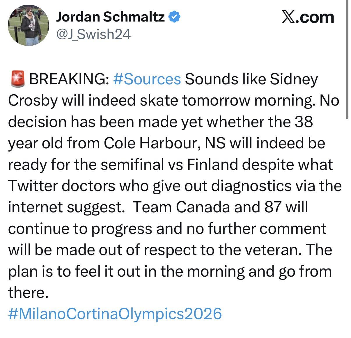 Qui sait s’il jouera (je suppose qu’il ne le fera pas contre la Finlande, mais s’ils gagnent, il jouera probablement avec un temps de glace limité dans le match pour la médaille d’or) mais Dieu merci, il semble que ce ne soit pas aussi mauvais que prévu.