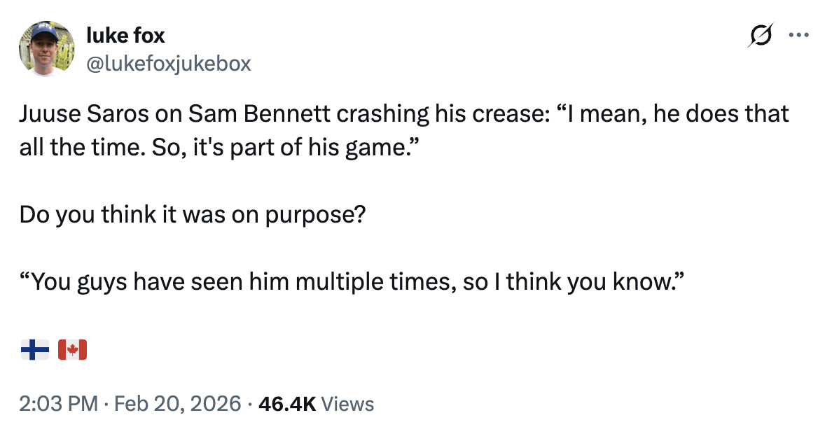 [Fox] Juuse Saros à propos de Sam Bennett qui s’écrase sur son territoire : « Je veux dire, il fait ça tout le temps. Donc, ça fait partie de son jeu. » Pensez-vous que c’était exprès ? « Vous l’avez vu plusieurs fois, donc je pense que vous le savez. »