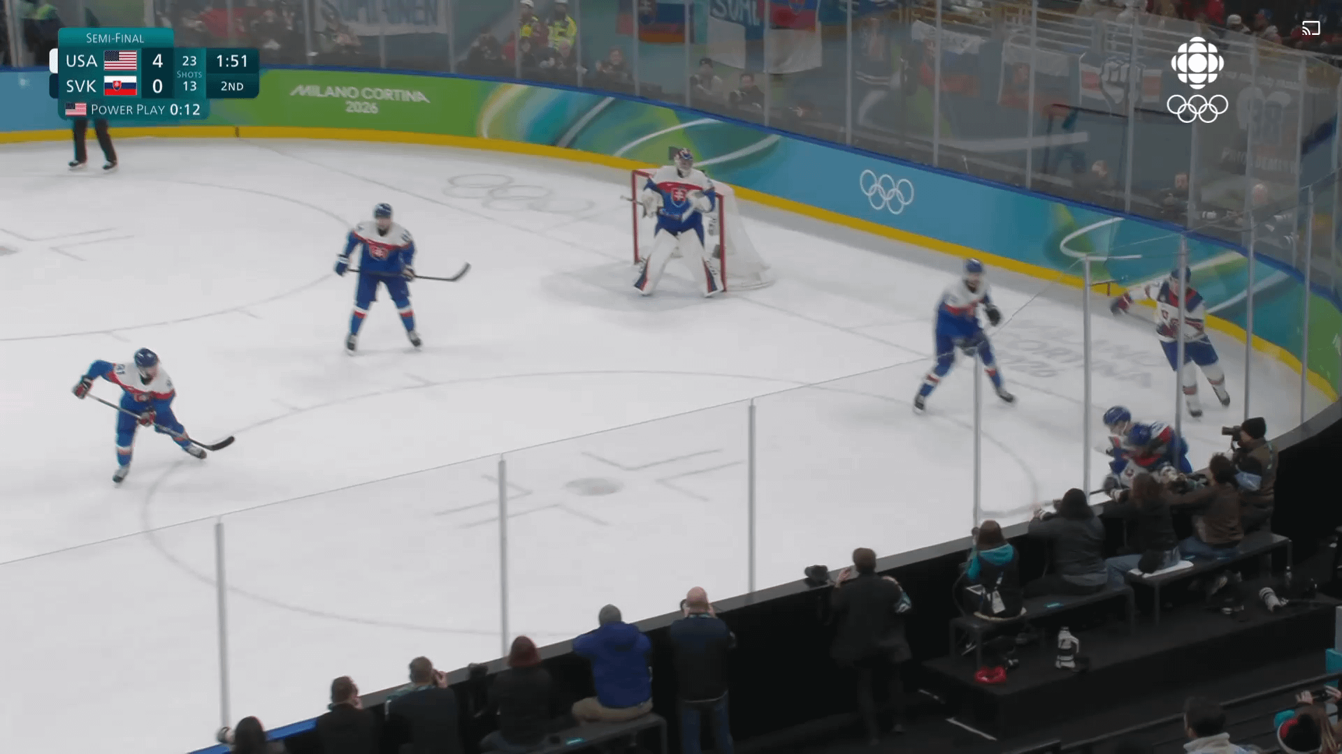 [USA (5)-0 SVK] Un tir passe large et rebondit sur les bandes arrière jusqu’à Jack Hughes, qui marque son deuxième du match.