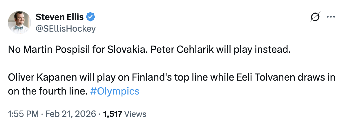 [Ellis] Pas de Martin Pospisil pour la Slovaquie. Peter Cehlarik jouera à sa place. Oliver Kapanen jouera sur le premier trio finlandais tandis qu’Eeli Tolvanen jouera sur le quatrième trio.