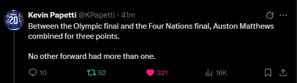 [Papetti] Entre la finale olympique et la finale des Quatre Nations, Auston Matthews a combiné pour trois points. Aucun autre attaquant n’en avait plus d’un.