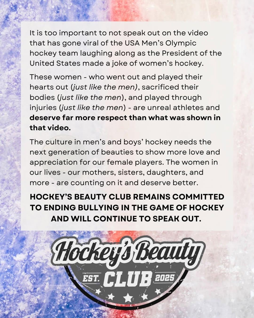 Le Hockey’s Beauty Club (l’organisation caritative de l’ancien diable Jon Merrill) a publié une déclaration sur l’équipe masculine des États-Unis.