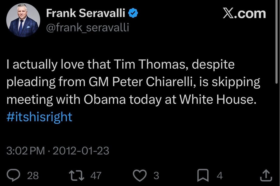 I don’t know why people can’t just say what they mean. « I liked when Tim Thomas didn’t visit Obama because I don’t like Obama. I don’t like that people didn’t visit Trump because I like Trump. »