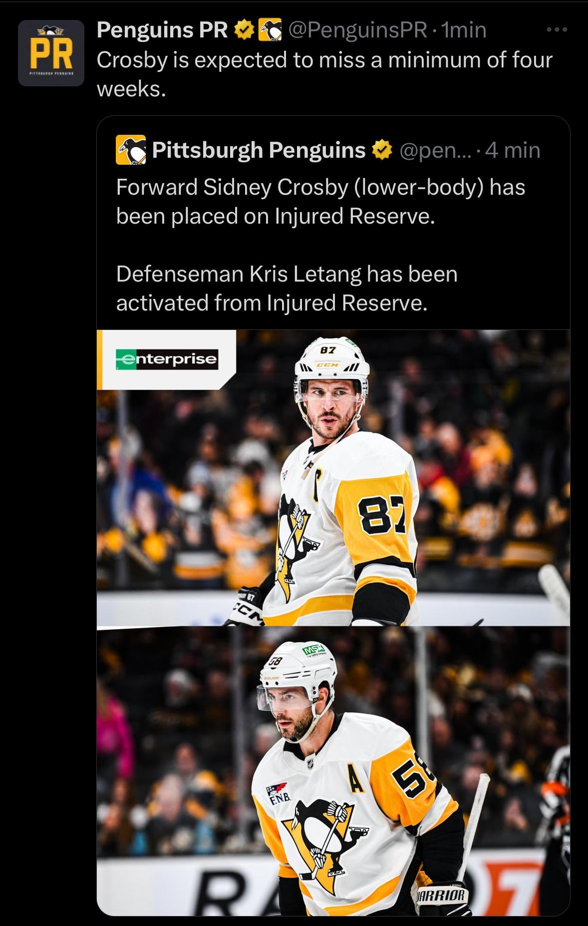 The NHL was rocked today with announcements from opposite sides of the USA. In Pittsburgh, GM Kyle Dubas let Penguins fans know that future HOF center Sidney Crosby will be on Injured Reserve for at least four weeks.