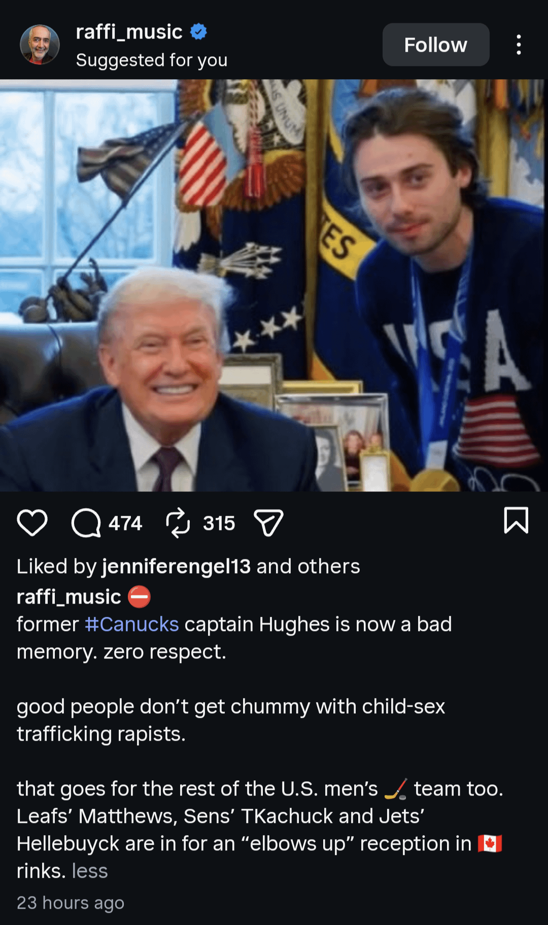 Next time an Ice agent shoots an off duty nurse in Minnesota, and Trump appears on TV calling them a « domestic terrorist » Quinn can say « I met that guy ». Hope it was worth it and I hope Wild fans turn their backs.