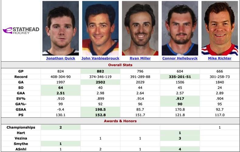 Helly might be the most talented american goalie of all time, but to compare their relative « greatness » amongst their own peers we need stats like WAR that take into account what era they played in.