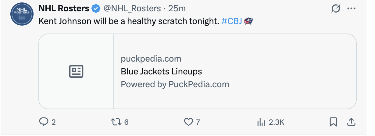 [NHL Rosters] Kent Johnson sera en bonne santé ce soir.