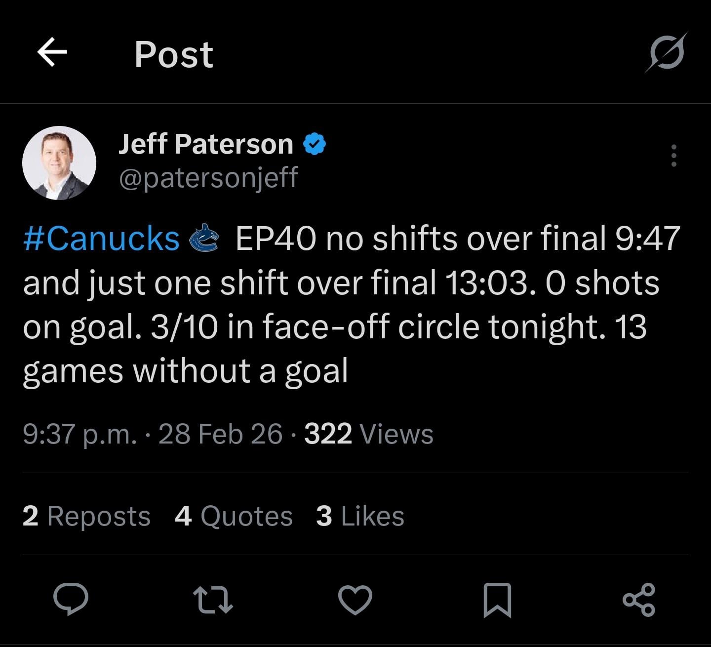 Selon JPat. Encore une nuit invisible pour l’EP40. Je déteste empiler ce gars… Apparemment, il a été touché par une rondelle en 3e, disaient les gars de CBC.
