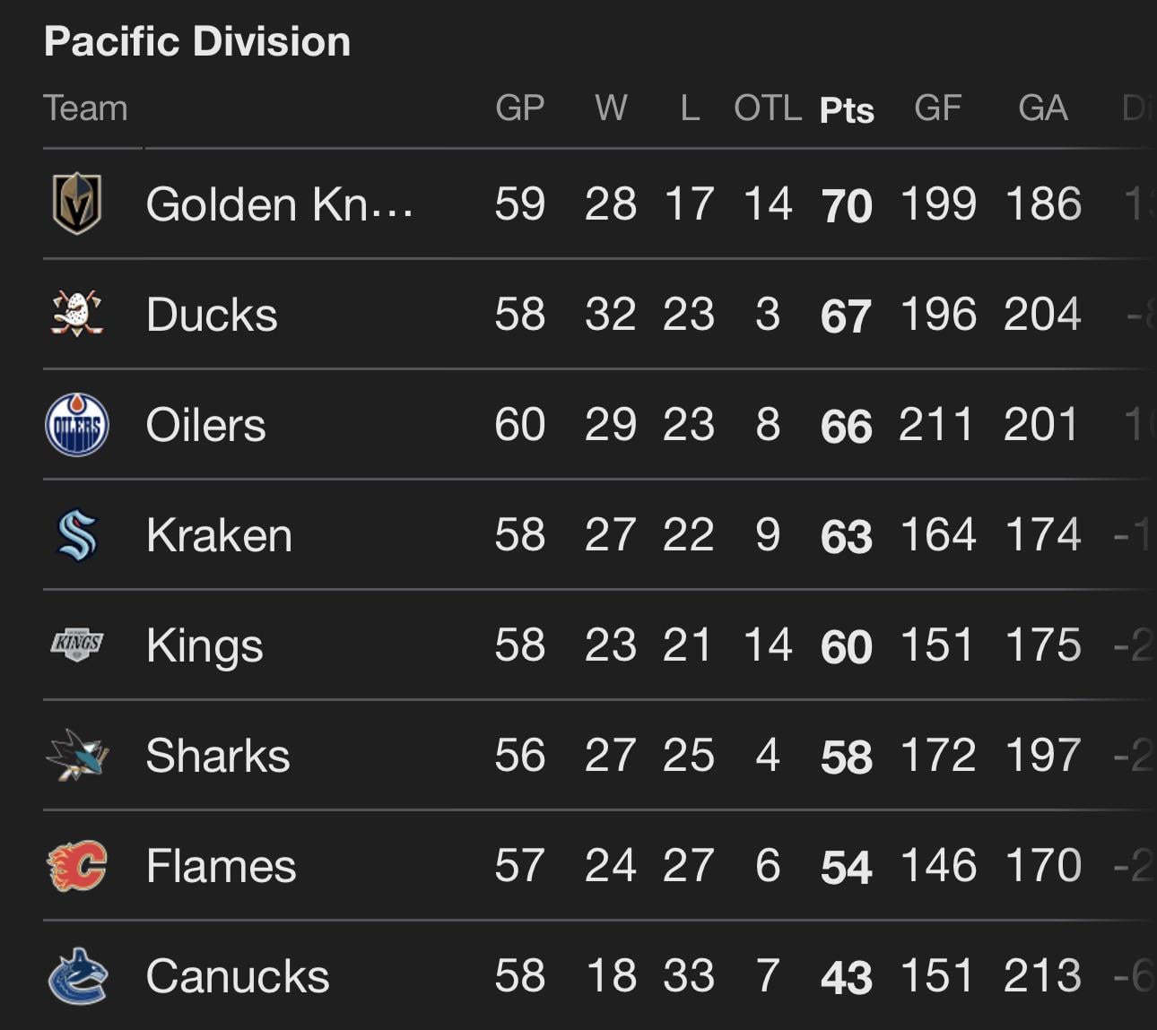 Avec la victoire des Ducks et la défaite réglementaire de Vegas, les Ducks ne sont plus qu’à 3 points de la première place du Pacifique avec un match en main.