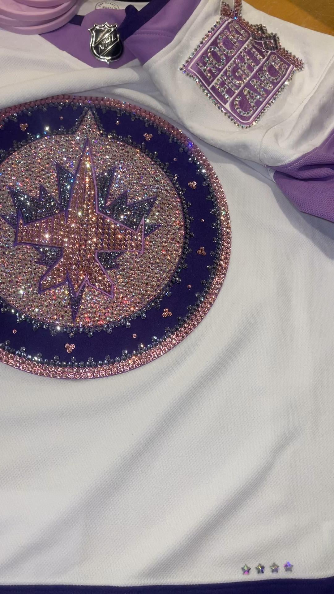 J’ai fait un traitement complet aux cristaux sur l’écusson (plus l’écusson d’épaule Hockey Fights Cancer) et j’ai travaillé dans des tons rose tendre pour honorer l’histoire du cancer du sein dans sa famille, tout en le gardant très « Jets ».