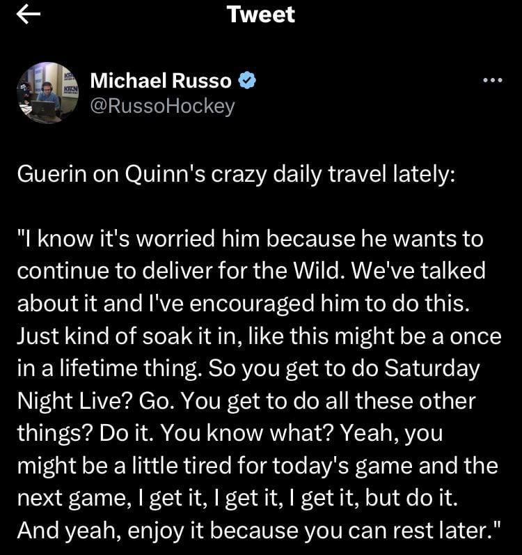 I’ve been wondering about that. What an insane last week. Win the gold in the morning Sunday, get sloshed after, fly to the US and apparently go drinking with Pat McAfee on Monday, go to DC for the State of the Union, (break on Wednesday?), fly to Colorado to play a game Thursday, fly to Utah to play Friday, Saturday fly to New York for SNL which is taped in the evening and notoriously goes late into the morning, fly back to Minnesota for Sunday afternoon game against the Blues. Yeesh.