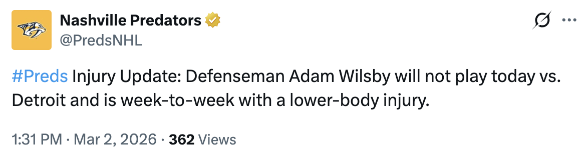 [Nashville Predators] Mise à jour sur les blessures : Le défenseur Adam Wilsby ne jouera pas aujourd’hui contre Détroit et souffre d’une blessure au bas du corps chaque semaine.