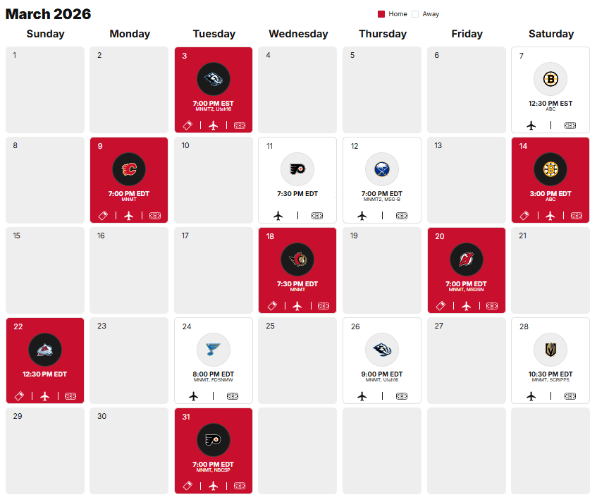 Gagner la plupart des matchs du mois de mars ne devrait pas être une tâche difficile. J’espère. Les Sabres, l’Avalanche et peut-être les Knights sont les équipes les plus coriaces ici ; nous avons une chance contre tout le monde.