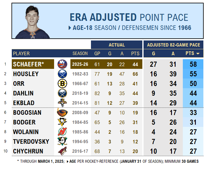 [Paul Pidutti] Vérification de l’inégalable Matthew Schaefer des Islanders parmi les défenseurs de 18 ans au cours des saisons – ajusté à l’époque : rythme de 27 buts = 11 de plus que quiconque, rythme de 58 points = 3 de plus que quiconque, rythme ajusté de l’ère : 11 buts, 8 points > Orr. Quels débuts amusants et brillants nous voyons.