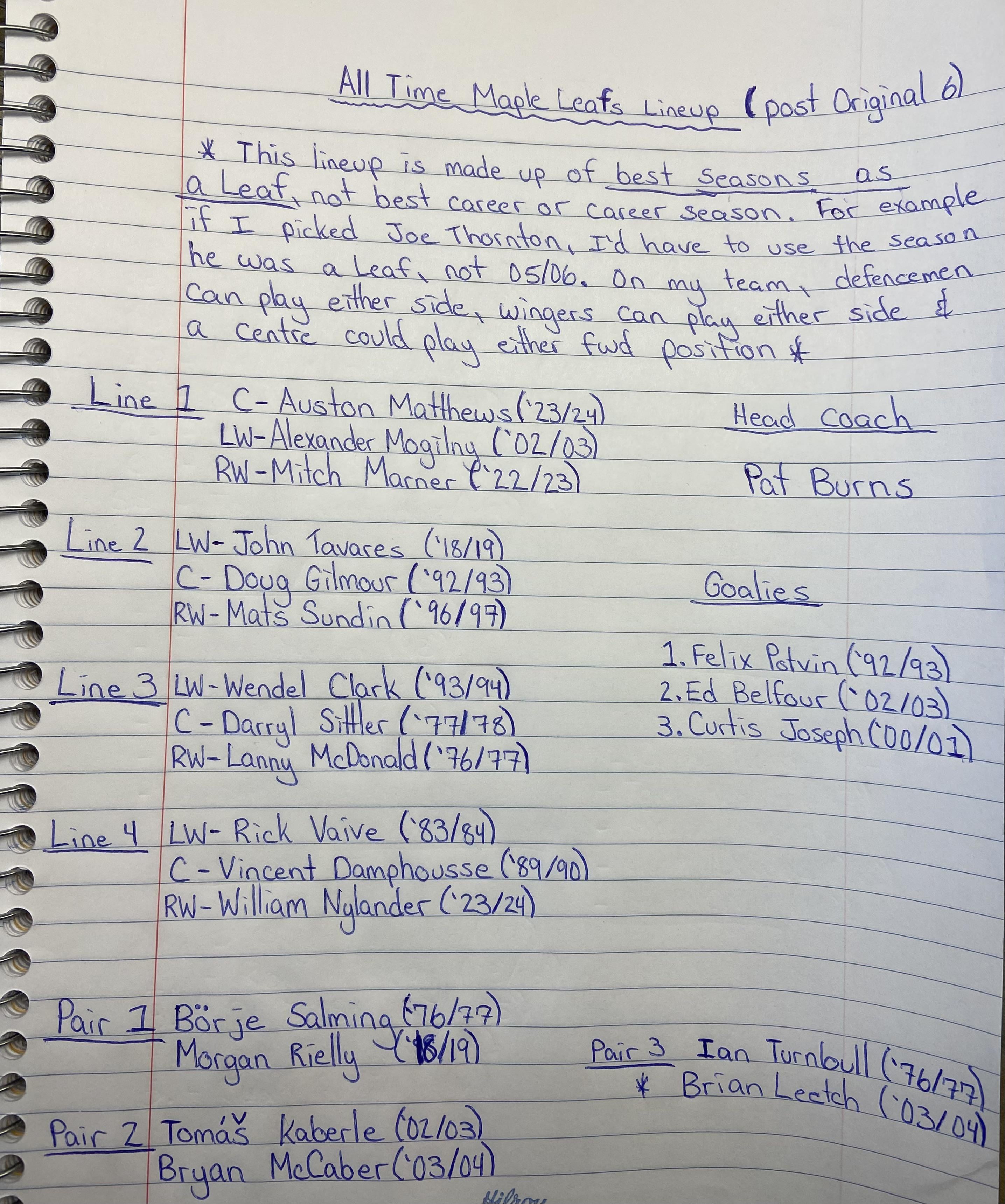 If you’re really going with single season performance, I’d take Gary Leeman 89/90 over Lanny McDonald 76/77 at RW on Line 3. Clark is gritty enough that you don’t need to pair him with McDonald and that prime Leeman Hound Line chemistry was a thing of beauty. Plus in terms of depth it gives you a constant skills-based elite forward. Wouldn’t want Leeman after 89/90, probably wouldn’t want him before. But that year he was magic. I wore #11 the whole time I played just based on his performance that season.