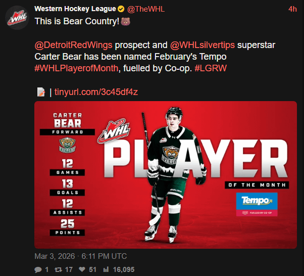 Carter Bear nommé joueur du mois de février dans la WHL — CMCdaGoat Association de l’EstAtlantic DivisionAtlantique DivisionDetroit Red WingsEastern ConferenceRed Wings de Détroit 7 Comments big_phat_gator 2 mois ago 25 points in 12 games is a good pace OctoWings13 2 mois ago Lighting it the fuck up! BellsBeersy 2 mois ago Better trade him littleking42 2 mois ago https://preview.redd.it/j0r2w14grwmg1.jpeg?width=1125&format=pjpg&auto=webp&s=9abbe63cfe921bbadae6f4559502b29e229ed160 Legitimately thought someone was commenting on this and comparing Carter Bear to a Pepsi polar bear 😆 littleking42 2 mois ago This might be a hot take, I honestly think he has the highest upside out of all our first rounders since Cossa (Kasper, Danielson, ASP, MBN). I’m preparing for him to be a steal as a mid-rounder. Pasha_Pup 2 mois ago I hate seeing how many people want to throw this kid into trade proposals. I really want to see him on the big team in a couple years Competitive_Dance478 2 mois ago What a dog Write A CommentVous devez vous connecter pour publier un commentaire.