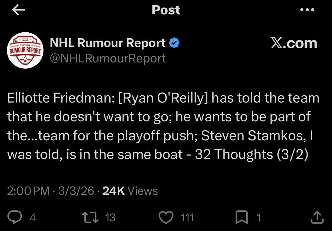 Specifically the report was that O’Reilly doesn’t want to be traded. Stamkos doesn’t either but IF the team is going to blow it up he will help find a good fit.