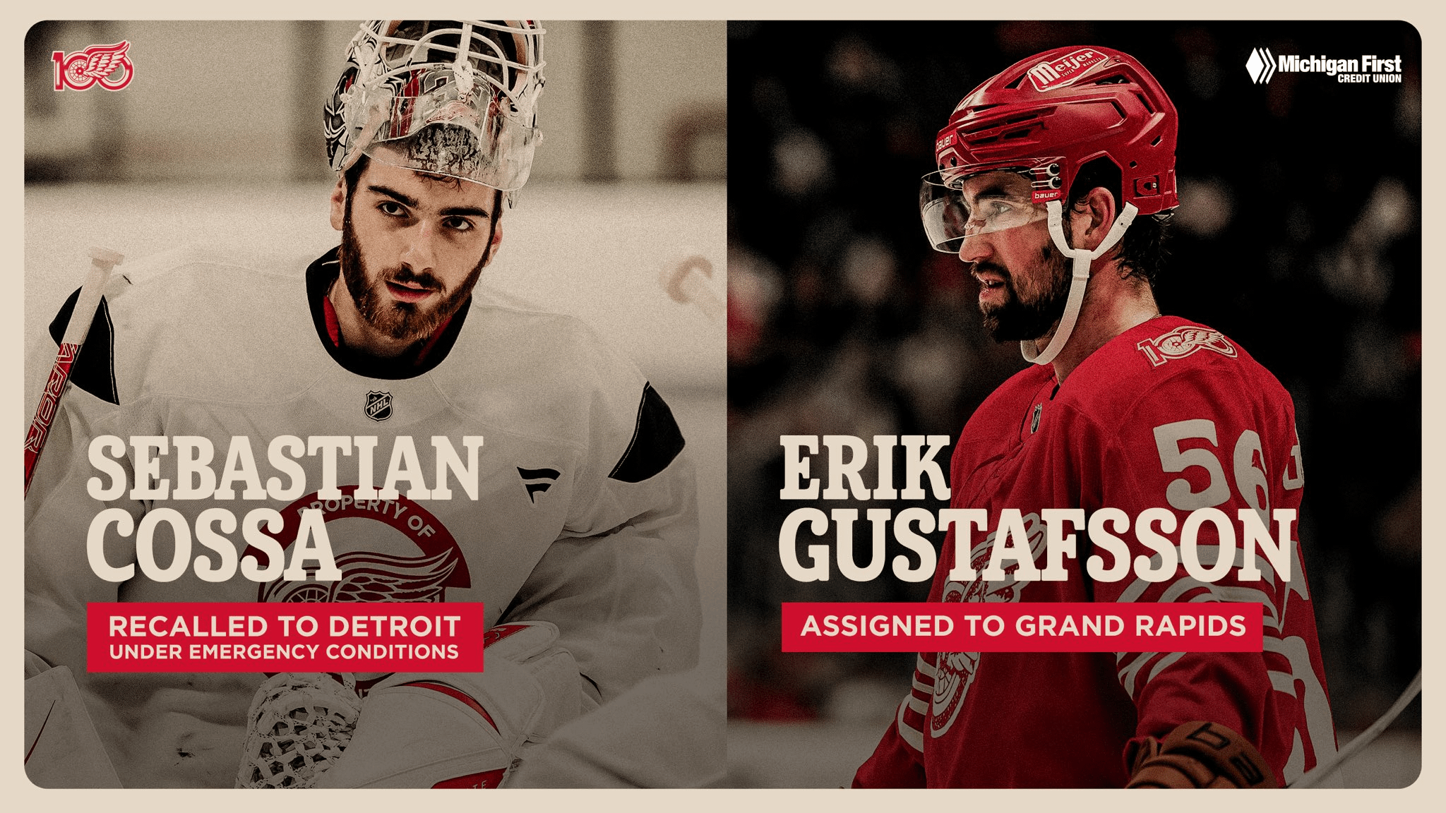 MISE À JOUR : Les Red Wings ont rappelé Sebastian Cossa des Griffins de Grand Rapids de la AHL dans des conditions d’urgence. De plus, Detroit a affecté Erik Gustafsson à Grand Rapids.