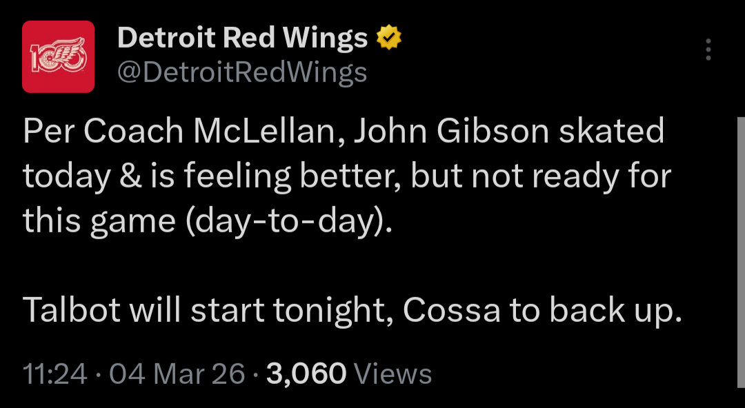 Not that I don’t want Cossa playing… but I think the Wings dodged a bullet having Gibson be day-to-day. Whew.
