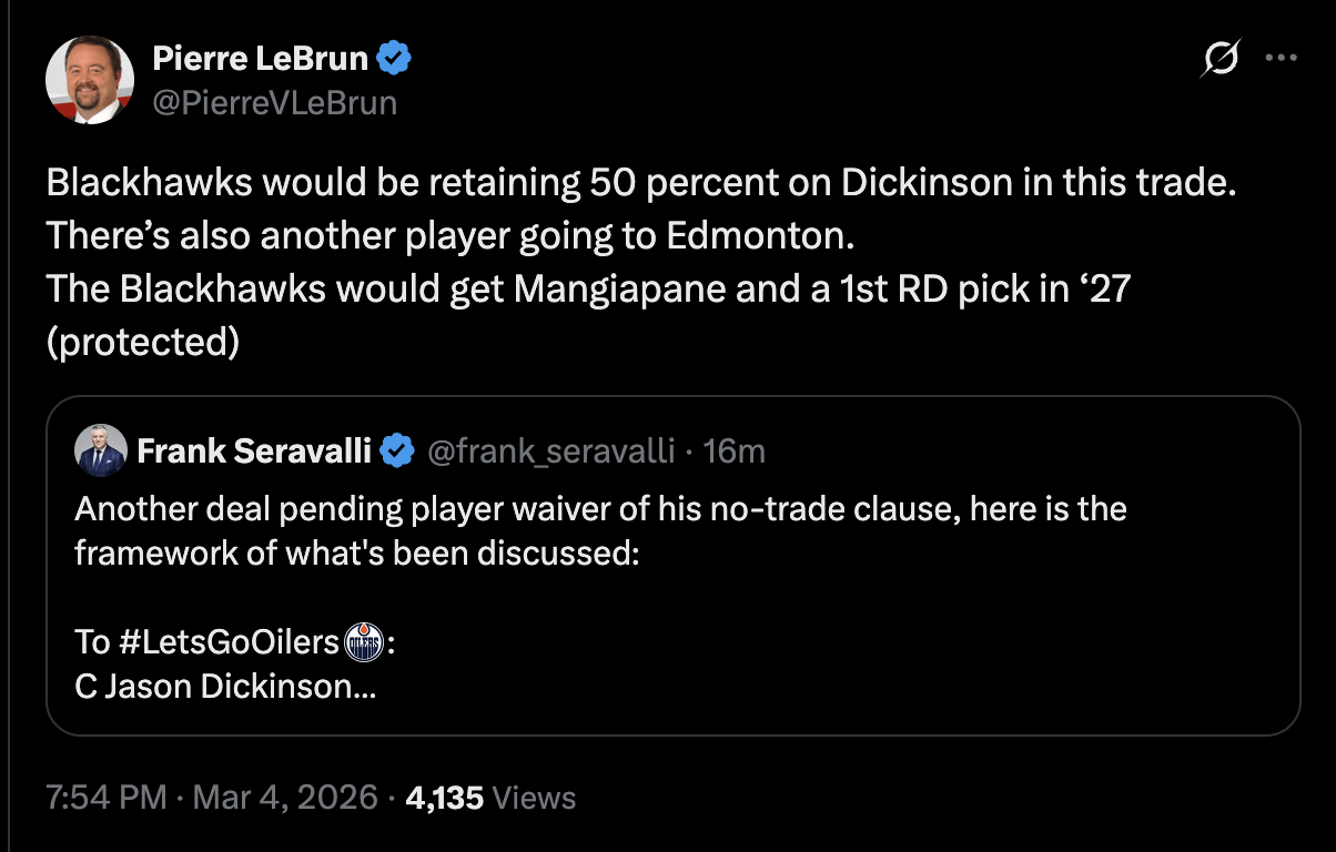 [Elliotte Friedman] Colton Dach is another part of this trade conversation to Edmonton.