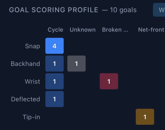 Comme vous pouvez le voir sur sa carte de joueur, il est très polyvalent dans l’endroit où il joue. Les équipes pourraient le jouer à n’importe quelle position d’aile. La plupart de ses buts proviennent du cycle, qui est une façon reproductible de marquer en séries éliminatoires.