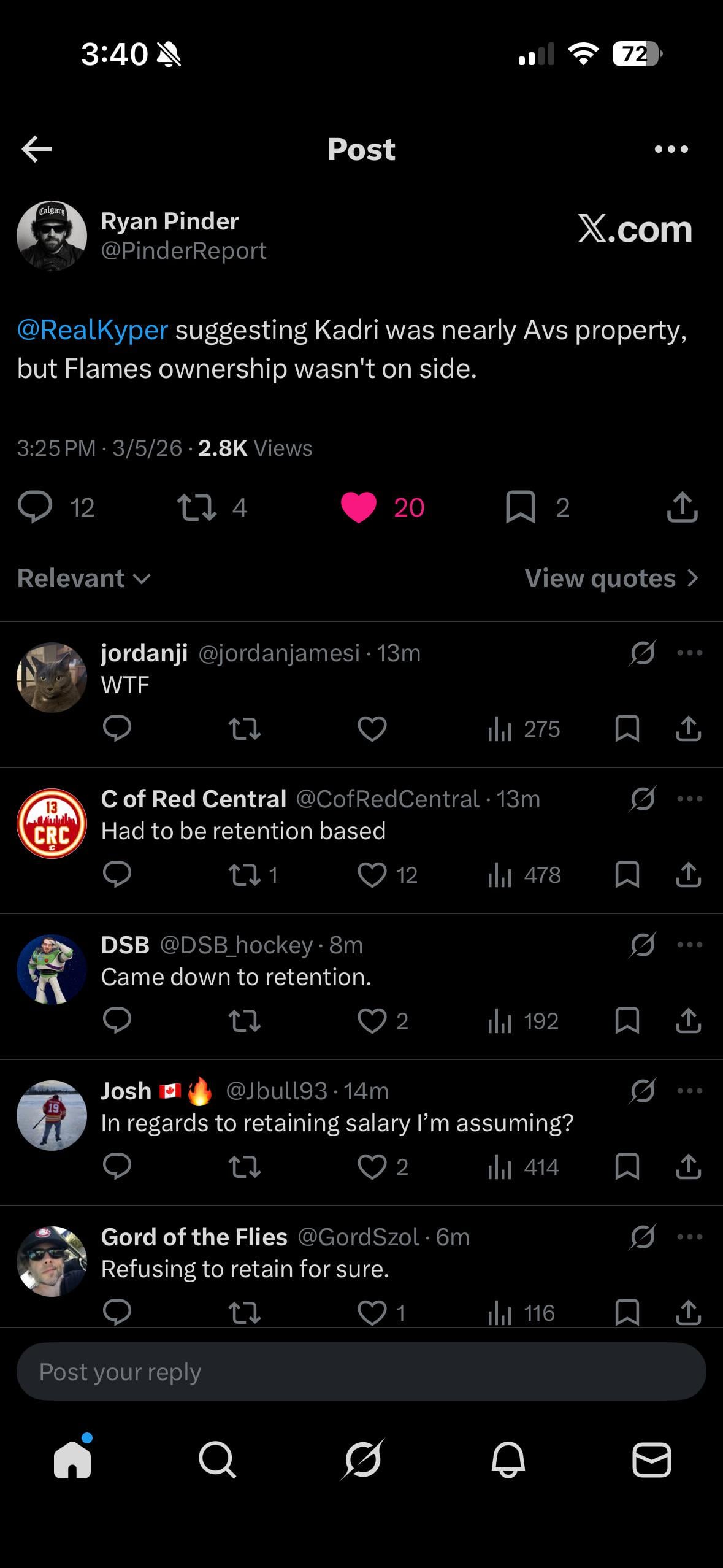 Calgary already has two of their three retention spots used up in the final year of markstroms deal as well as in andersson’s trade. Given the way the market is right now it’s not a bad idea to hold off and see if guys will cough up extra for retention on Coleman or kadri by the TDL, and if nothing else I’d bet COL circles back this summer if Roy doesn’t get it done for them… I’ve said all year that I always felt Kadri was going to be a summer move if we ever trade him
