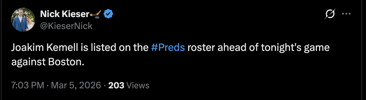 [Kieser] Joakim Kemell est inscrit sur la liste des Preds avant le match de ce soir contre Boston. — catsgr8rthanspoonies Association de l’OuestCentral DivisionCentrale DivisionNashville PredatorsPredators de NashvilleWestern Conference 2 Comments catsgr8rthanspoonies 2 mois ago Milwaukee may not have a team come this weekend. The two teams below them are pretty far out of playoff contention, thankfully. kjframe1223 2 mois ago Are we making a cup run now? Write A CommentVous devez vous connecter pour publier un commentaire.