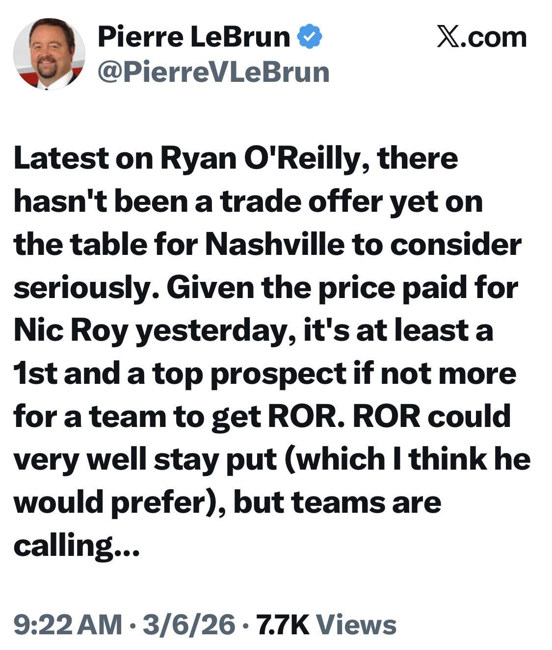 [LeBrun] Dernièrement concernant Ryan O’Reilly, il n’y a pas encore eu d’offre commerciale sur la table que Nashville puisse considérer sérieusement. Vu le prix payé pour Nic Roy hier, c’est au moins une 1ère et un top prospect sinon plus pour qu’une équipe obtienne le ROR.