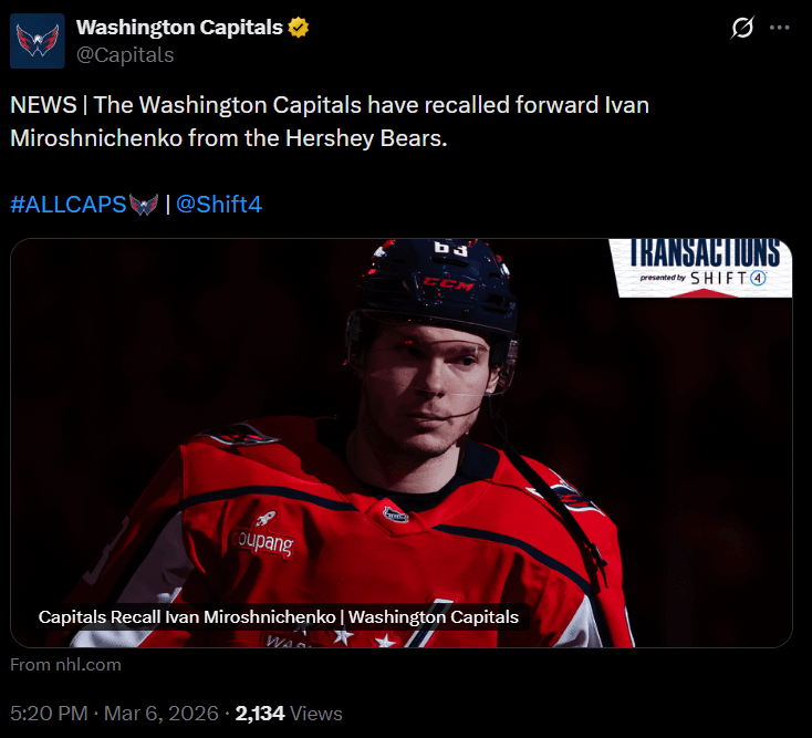 Les Capitals de Washington ont rappelé l’attaquant Ivan Miroshnichenko des Hershey Bears — ashcaps Association de l’EstCapitals de WashingtonEastern ConferenceMétropolitaine DivisionMetropolitan DivisionWashington Capitals 10 Comments MetalMan1973 2 mois ago Well this brightens my day zabadawabada 2 mois ago Stoked on this. Let’s get him the next 20 or whatever games under his belt. MattAlive13 2 mois ago Wait, with the trades, wouldn’t this put us at 24 skaters, and over the limit? Joshottas 2 mois ago 19 games left…would love to see at least 8 points. Ice time will be there. espnrocksalot 2 mois ago Maybe it was all worth it timwhatley993 2 mois ago Wish carbs actually gave these young guys ice time instead of 8 min of sheltered play bobbimorses 2 mois ago Marked safe Hayden8184 2 mois ago Glad he will get a game but I’m guessing he’s coming up because Kampf won’t be at the game in Boston. Edited: he won’t be at the game in Boston. BatRevolutionary3056 2 mois ago Great. We need to bring up the young guns and let them sink or swim. Dull_Hedgehog_1263 2 mois ago Hopefully for good this time, he has nothing left to prove in the AHL. Write A CommentVous devez vous connecter pour publier un commentaire.