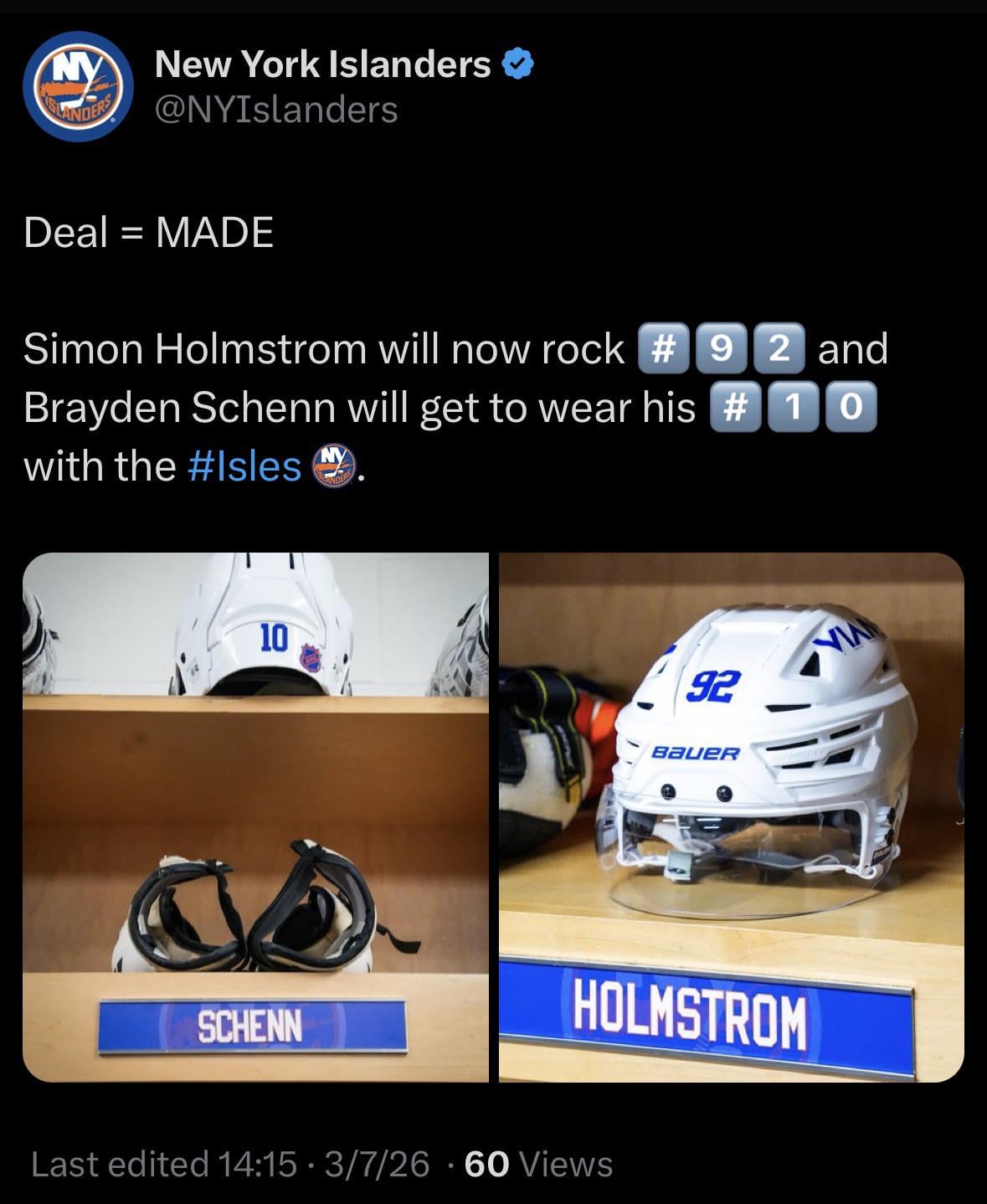 Brayden Schenn portera le numéro 10 et Holmstrom passera au numéro 92.
