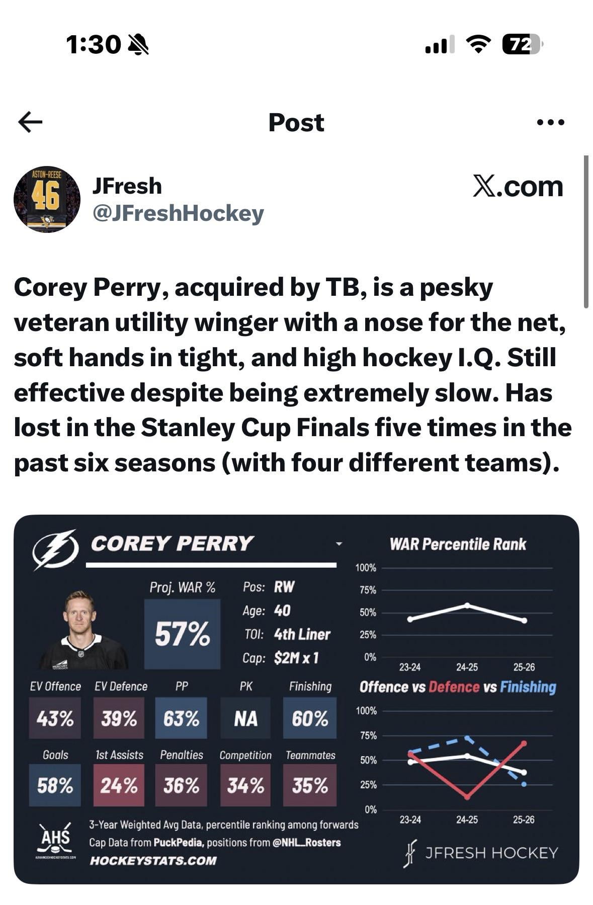 JFresh insights sur Perry pour les personnes intéressées — MrSCR23 Association de l’EstAtlantic DivisionAtlantique DivisionEastern ConferenceLightning de Tampa BayTampa Bay Lightning 14 Comments srj251194 1 jour ago He’s the net front pest we’ve been missing especially on the PP kiezenz 1 jour ago Okay look. Glendening is on waivers and PEB is a free agent. All I’m saying… Freethinker9 1 jour ago He’s over due GrrGecko 1 jour ago I’d rather lose in the Stanley Cup Finals than anywhere else 🤷🏻♂️ Gullible_Classroom71 1 jour ago I think he’d fit great on the gourde line. maybe swap him for zemgus. anwright1371 1 jour ago It’s a 2nd round pick 3 drafts away for a 4th line ROCK. I’m all for this trade, we need some attitude right now steelhorizon 1 jour ago Losing in the SCF is back on the menu! Emergency_Egg1281 1 jour ago Time for him to WIN ONE BABY !!!!!!!! Paper_Rain 1 jour ago Stanley Cup Finals here they come kieranichiban 19 heures ago Well we will get to the finals at least! Let’s get him a bolts cup before he retires. takinganewtack 18 heures ago He won the cup in 2007, not sure why people keep saying he is cursed. Trust JBB, he’s better at his job than any of us. CelebrationPeach6157 14 heures ago https://preview.redd.it/gvcdcnql0nng1.jpeg?width=1170&format=pjpg&auto=webp&s=3038bb0b09622434db72c11037b7464ab299549f Interesting post that Corey Perry was brought in specifically at Coop’s request I haven’t tried to see if I can find video from the NHL network for this, which is cited as the source. But I’m guessing this is reliable information. OppositeSolution642 13 heures ago What’s his role, exactly, 4th line and 2nd power play? CelebrationPeach6157 12 heures ago https://preview.redd.it/b735hqs4inng1.jpeg?width=1170&format=pjpg&auto=webp&s=64e101d078b081c258338642287ec4560da8e990 Write A CommentVous devez vous connecter pour publier un commentaire.