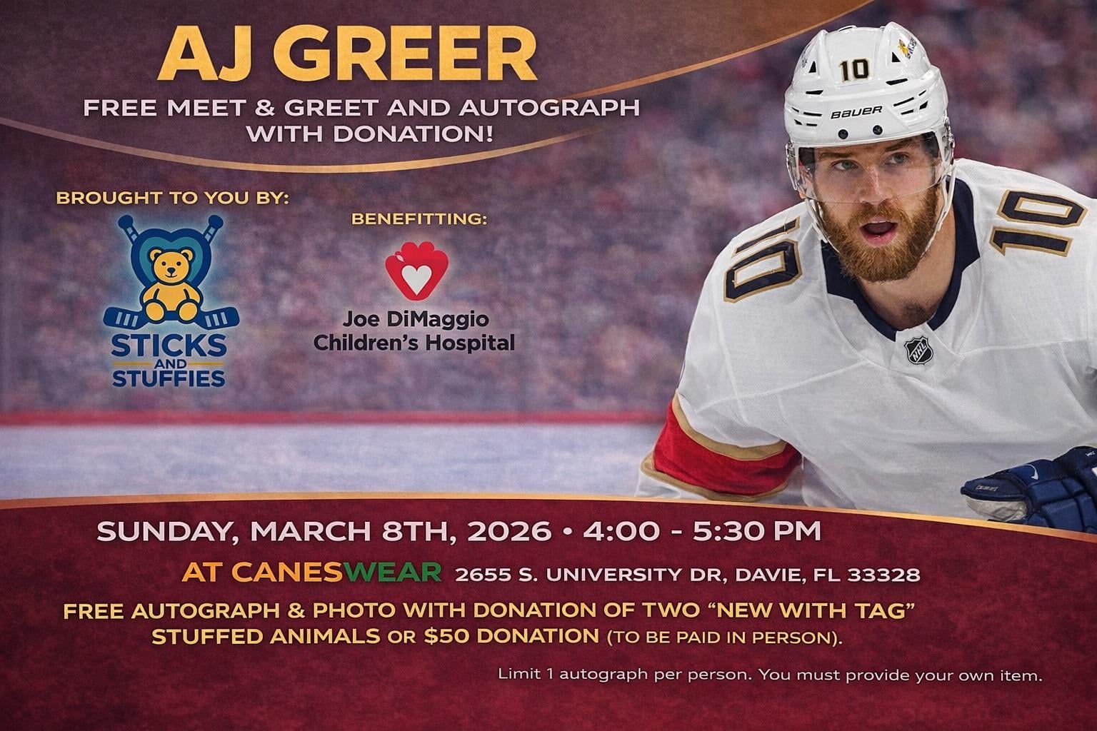 L’événement profite à l’hôpital pour enfants Joe DiMaggio et l’admission comprend deux animaux en peluche neufs avec étiquette ou un don de 50 $ en échange d’un autographe et d’une photo.