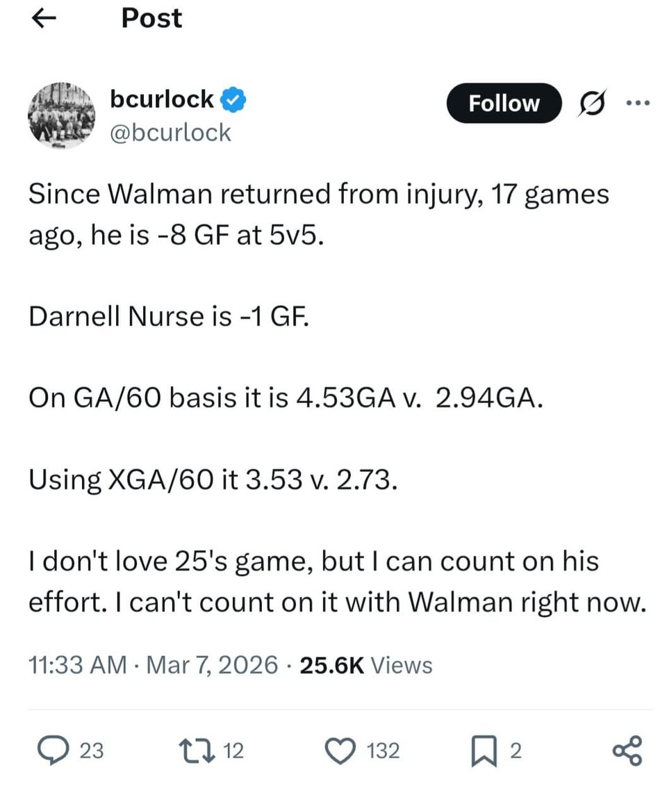 Wallman’s game hasn’t been good, but he has been playing his offside, while nurse hasn’t, so it’s not an apples to apples comparison.