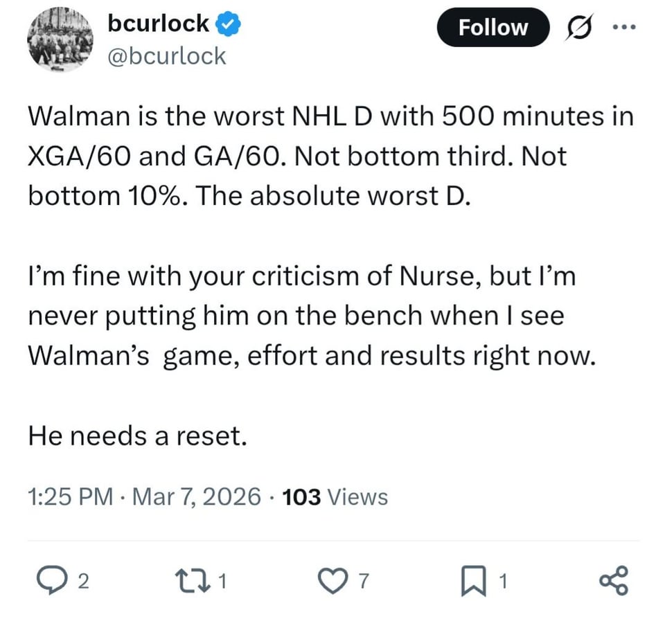 Anyone consider he’s still got some lingering injury and doesn’t have spring NHL wind back yet? Naw he must be terrible. He must have forgotten how he saved our playoffs with Ekholm out. This is definitely the real Walman for sure, I say from my couch.