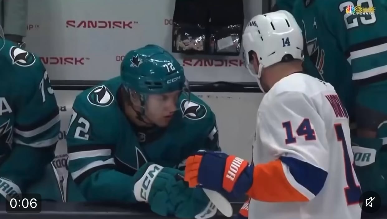 Who is that Shark player? A close friend from the minors? No one jumped over the bench to pound Bo, but that would have earned them a big penalty. If that wasn’t just two buddies messing around, the Sharks at least would have hunted him down as soon as the puck dropped.