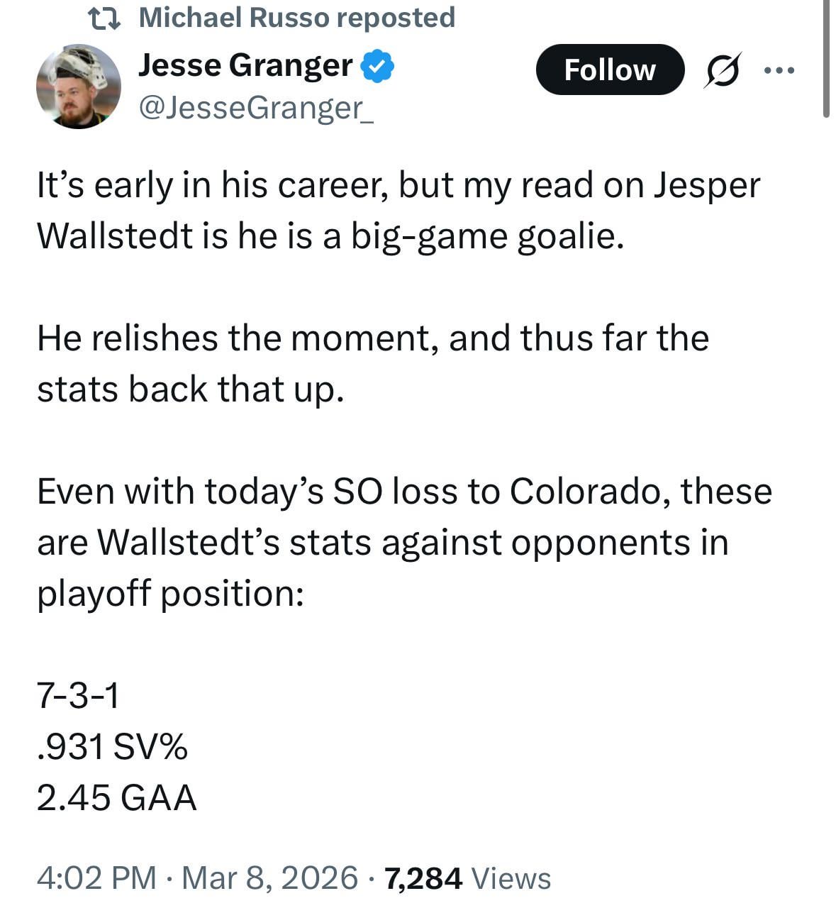 [Granger] Il est au début de sa carrière, mais d’après ce que j’ai lu sur Jesper Wallstedt, il est un gardien de but pour les grands matchs.