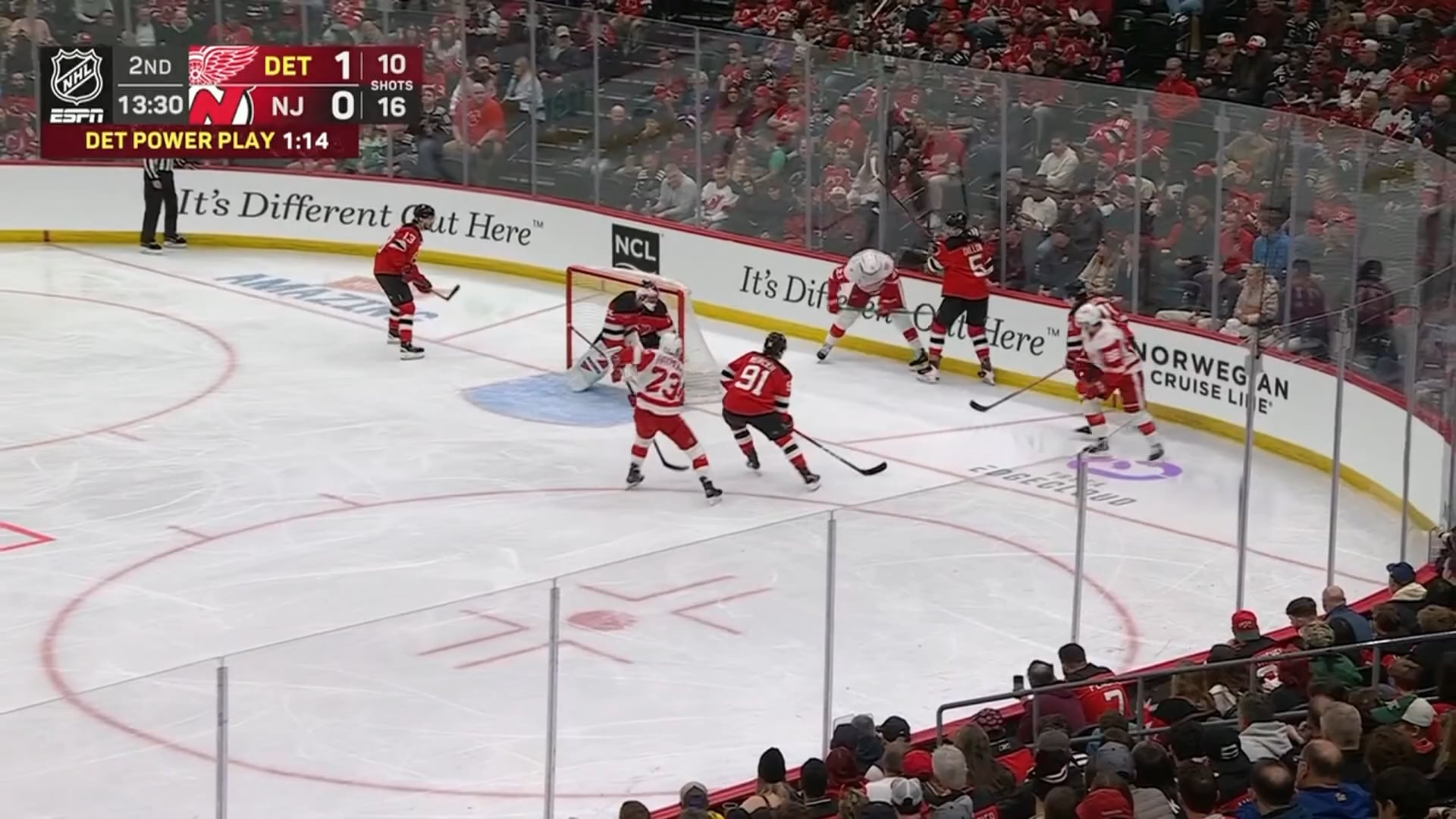 [DET (2) – NJD 0] Seider en lance un depuis la ligne bleue et JVR fait une pointe d’embrayage pour prendre une avance de 2 buts