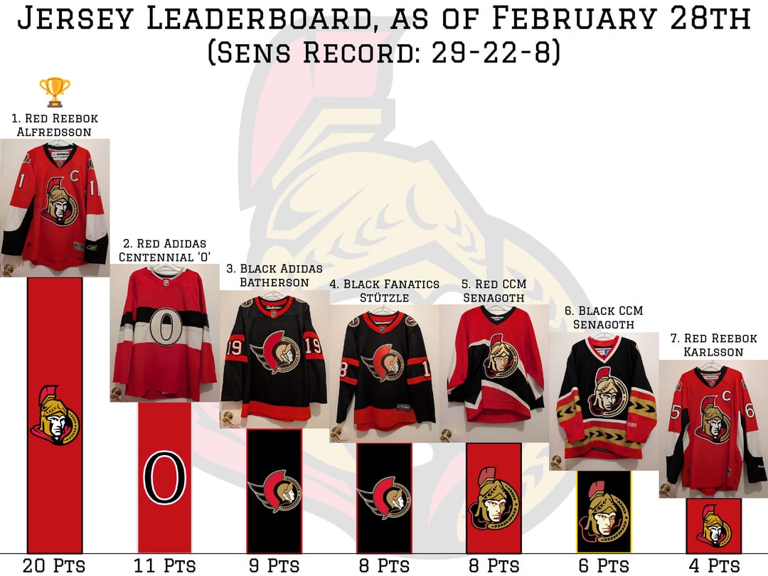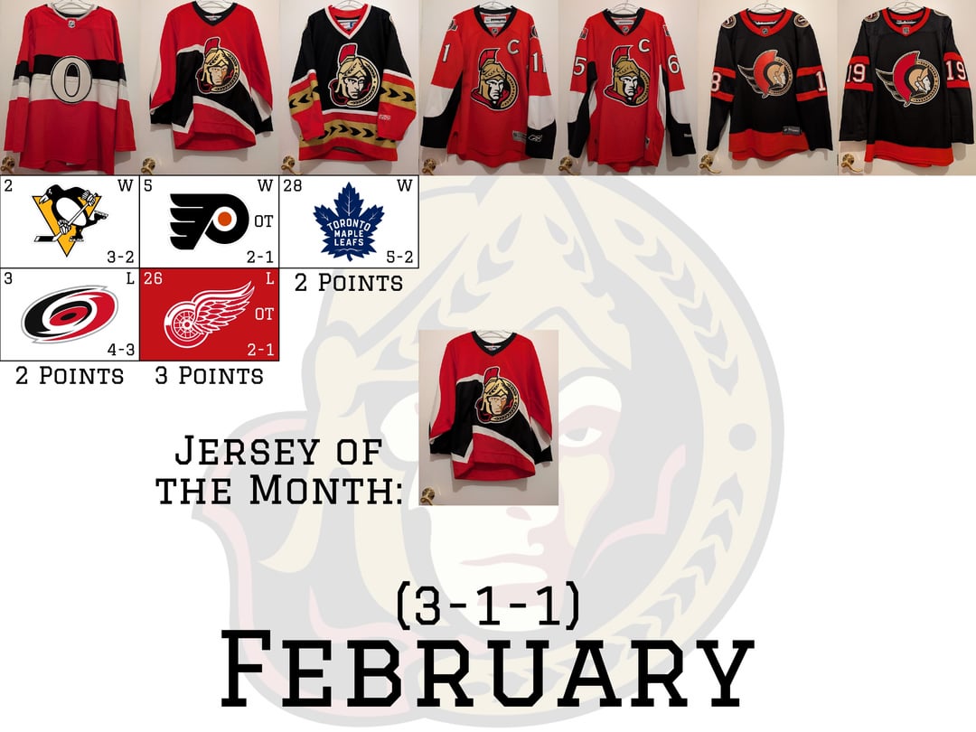 Pour ceux d’entre vous qui ne le savent pas, je publie chaque mois une rétrospective du record WL-OTL des Sénateurs. pour ce mois-là, classé selon le maillot des Sénateurs que je portais pour chaque match ce jour-là (ou que je portais "en esprit"puisque je n’ai pas toujours l’occasion de porter le rouge et le noir !). Si les Sénateurs gagnent un match alors que je porte un maillot, je porte à nouveau ce maillot et je le porte jusqu’à ce que les Sénateurs perdent. Ensuite, je passe au maillot suivant dans l’ordre. Chaque mois, je compte ensuite le nombre de points de chaque maillot "gagné" pour l’équipe, pour déterminer lequel de mes maillots des Sénateurs est le meilleur/le plus chanceux ! Ce maillot gagnant sera alors le maillot que je porterai pour les séries éliminatoires.
