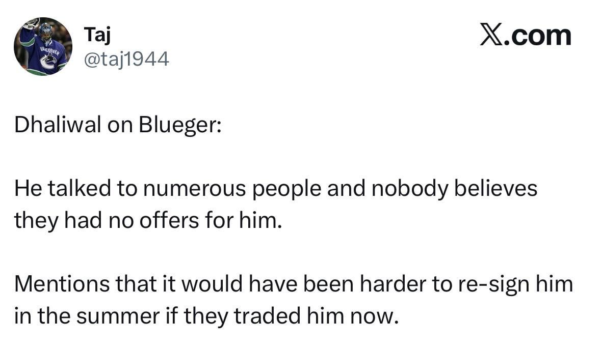 With one of the weakest free agency periods coming up, Blueger is going to get overpaid by any team that picks him up. But will cost the Canucks more because he knows they have nothing behind him except Chytil and the mittens sewn on his sweaters after his 73rd concussion