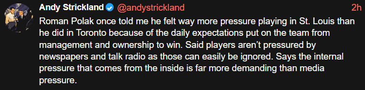 [Strickland] Roman Polak m’a dit un jour qu’il ressentait beaucoup plus de pression en jouant à St. Louis qu’à Toronto en raison des attentes quotidiennes de la direction et des propriétaires pour gagner. Ces joueurs ne subissent pas la pression des journaux et des discussions à la radio, car ceux-ci peuvent facilement être ignorés.