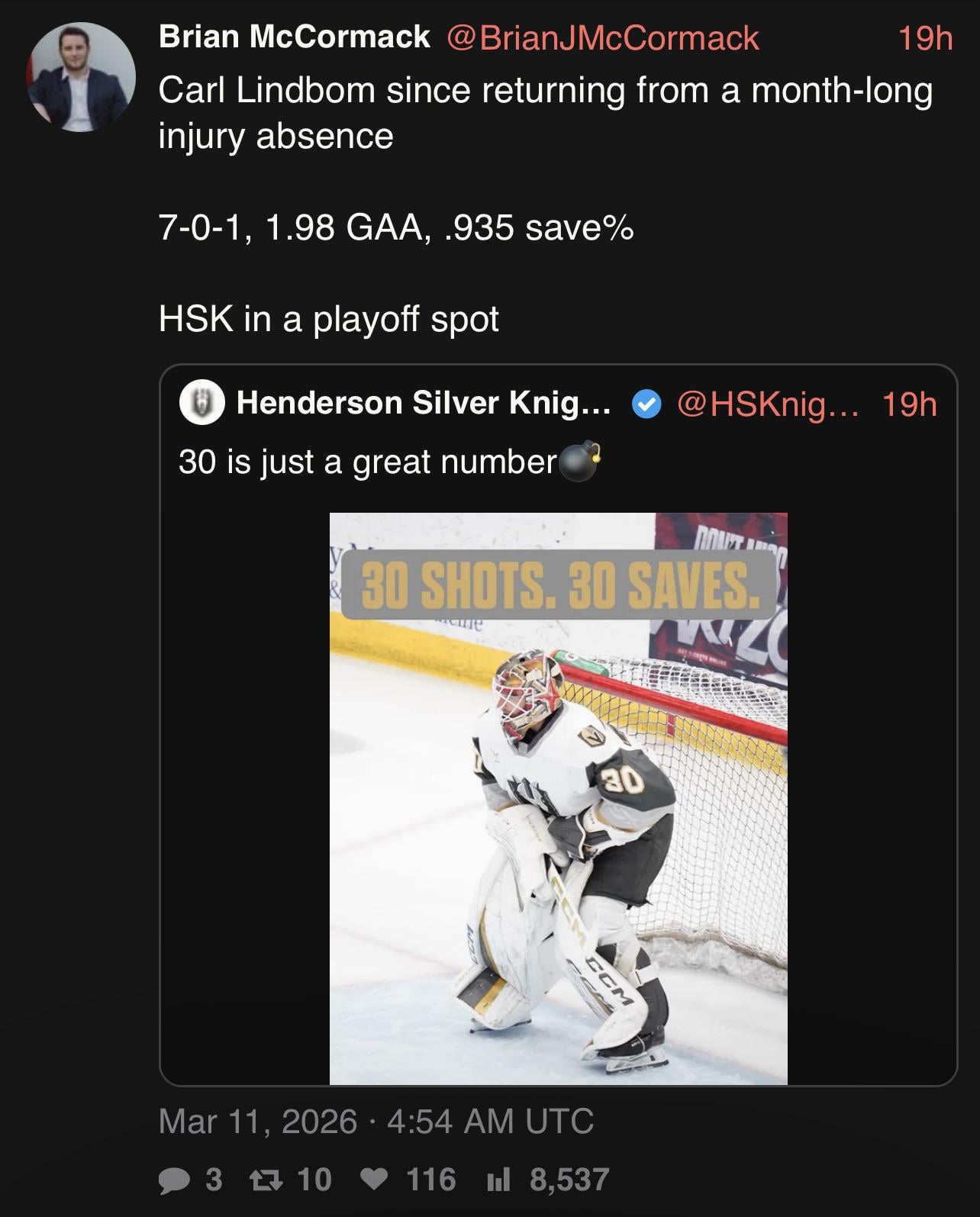 Need Hill and Schmid to play a little harder so this guy can actually get more reps in the AHL. I do not want to lose Cassidy at all and he will take the hit if we don’t make the playoffs