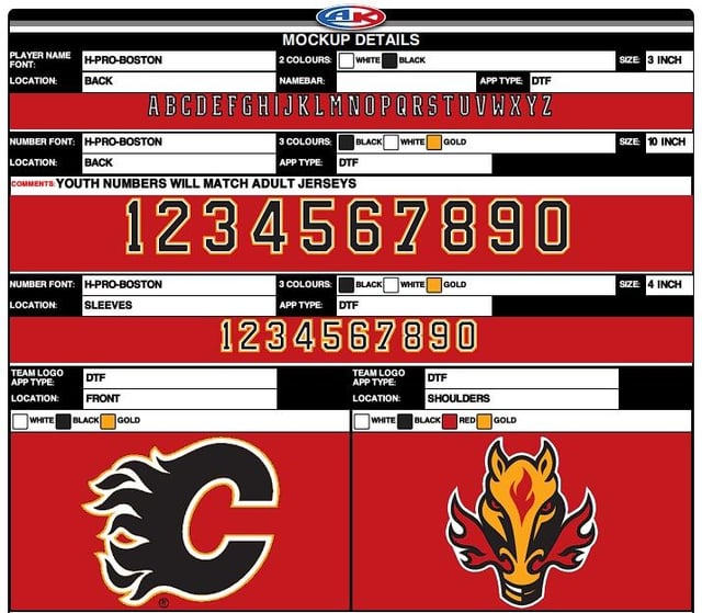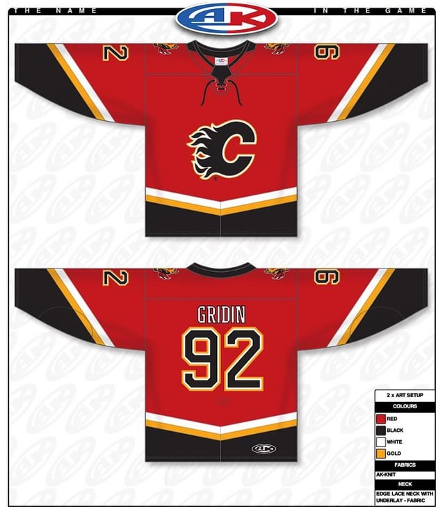 Étant donné que la rumeur actuelle concernant notre gamme de pulls la saison prochaine est qu’elle inclura un retour en arrière de 2004, j’ai décidé de m’essayer à la création d’une maquette conceptuelle personnelle dans l’Athletic Knit Jersey Customizer. Le seul véritable changement que j’ai apporté a été de me débarrasser de la bande noire redondante au-dessus du blanc et de l’or pour un look global plus soigné. Une version simple des polices de noms et de numéros des Flames de Calgary n’était malheureusement pas disponible, j’ai donc opté pour celles des Bruins de Boston ; ils ont une similitude passagère, et je pense que la location en angle et la numérotation n’étaient vraiment pas très belles. L’équipe de marque, de conception et de marketing des Flames a montré sa volonté d’innover et de peaufiner les anciens designs avec les première et deuxième révisions des maillots « Blasty » (rendant noirs le bas et les manches initialement rouges, puis gaufrant des flammes dessus pour remplir l’espace négatif), alors j’espère qu’ils feront de même ici. J’espère que vous l’aimerez tous, tous les commentaires sont les bienvenus, et si vous le souhaitez, vous pouvez visiter le site Web d’Athletic Knit et créer le vôtre.
