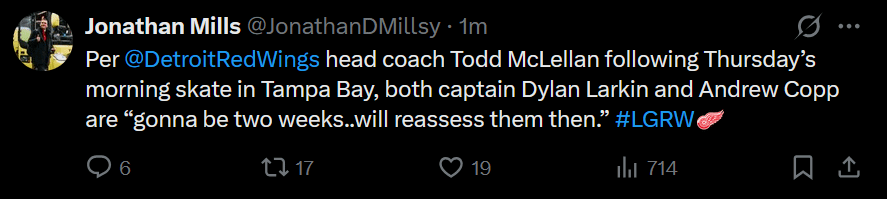 [Mills] Selon l’entraîneur-chef des @DetroitRedWings, Todd McLellan, après l’entraînement matinal de jeudi à Tampa Bay, le capitaine Dylan Larkin et Andrew Copp « vont prendre deux semaines… ils les réévalueront alors ». #LGRW