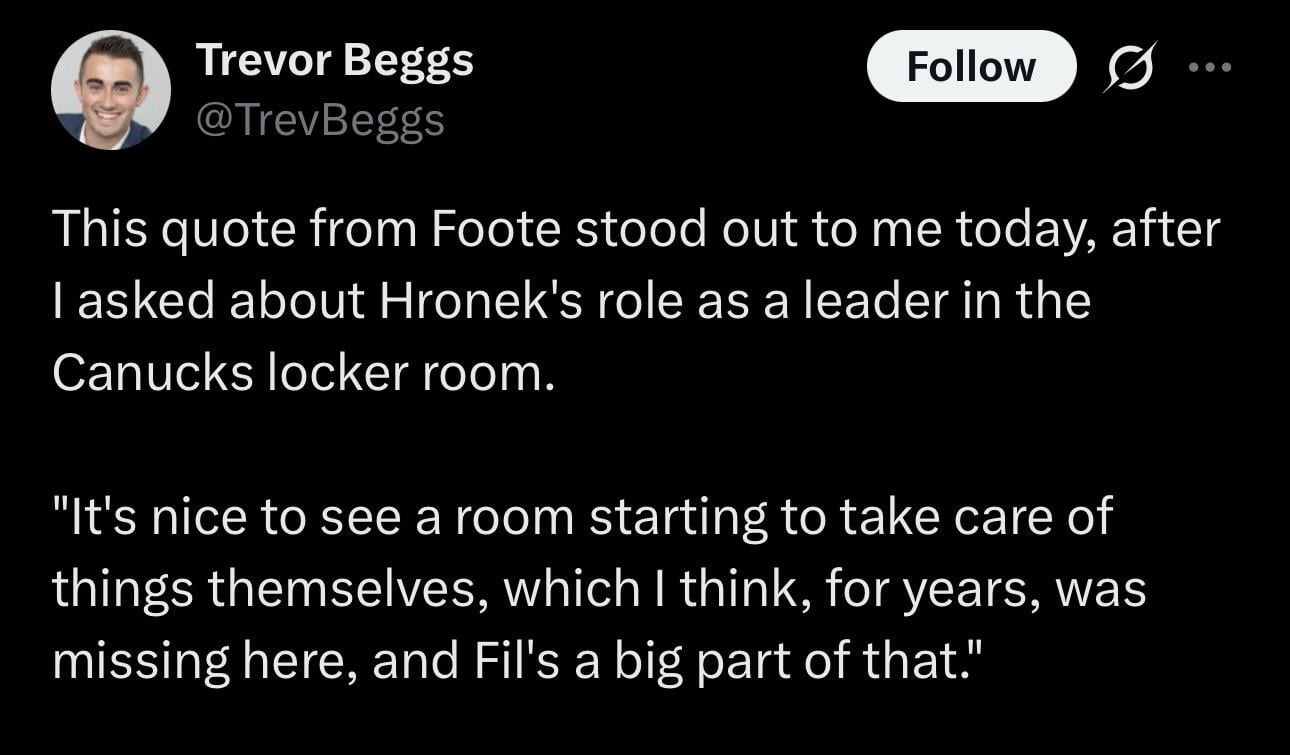 Big takeaway for Canucks fans is they should realize unless they’re in that room they have no idea how good someone like Hughes is at leadership and believing some 18 year old is a future captain is silly.