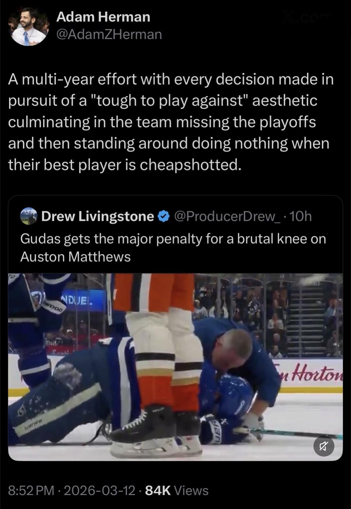 Reilly and Nylander saying they didn’t see it and that they should have done something is laughable. Do you think the Lightning, Panthers, or Bruins players care if they see the full play if any of their players are lying on the ice? Let alone the captain of the team