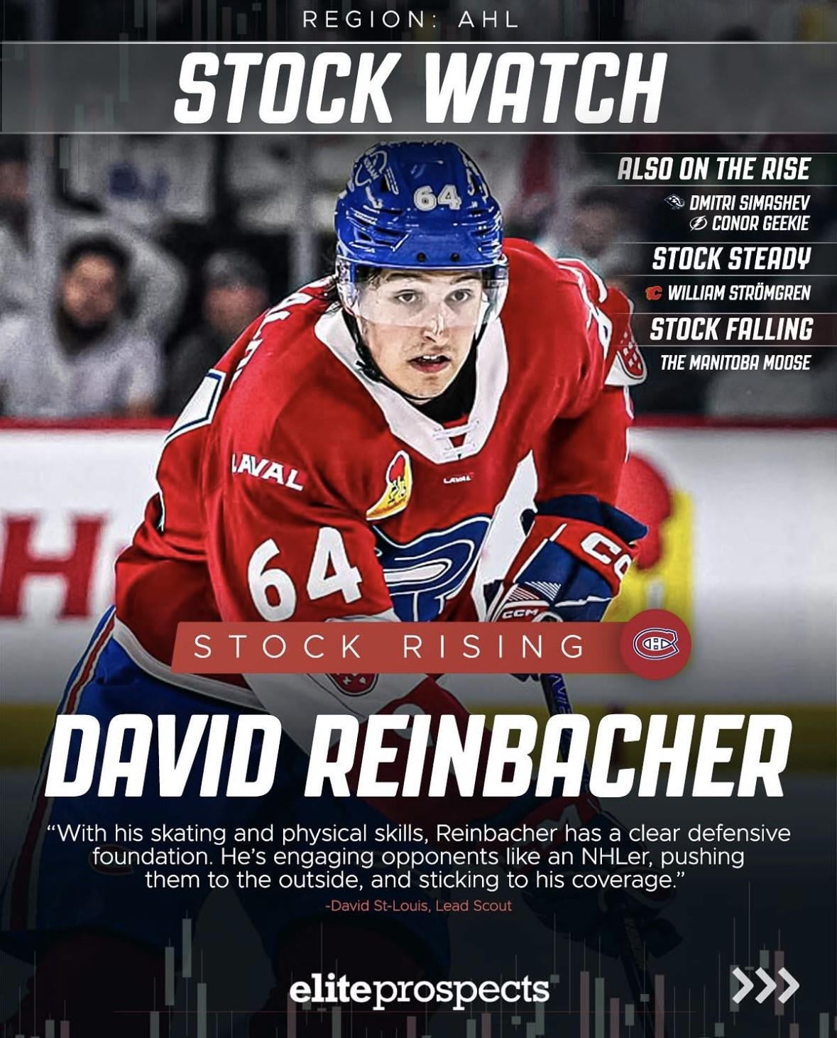 Ce remplaçant est bien conscient du changement intervenu dans le jeu de Reinbacher au cours des derniers mois. Cela fait du bien de lire cette positivité pour un prospect qui a connu une évolution assez malheureuse jusqu’à présent. Je suis heureux de voir que sa récente ascension fait de lui une vedette, comme le soulignent Elite Prospects et David St-Louis.