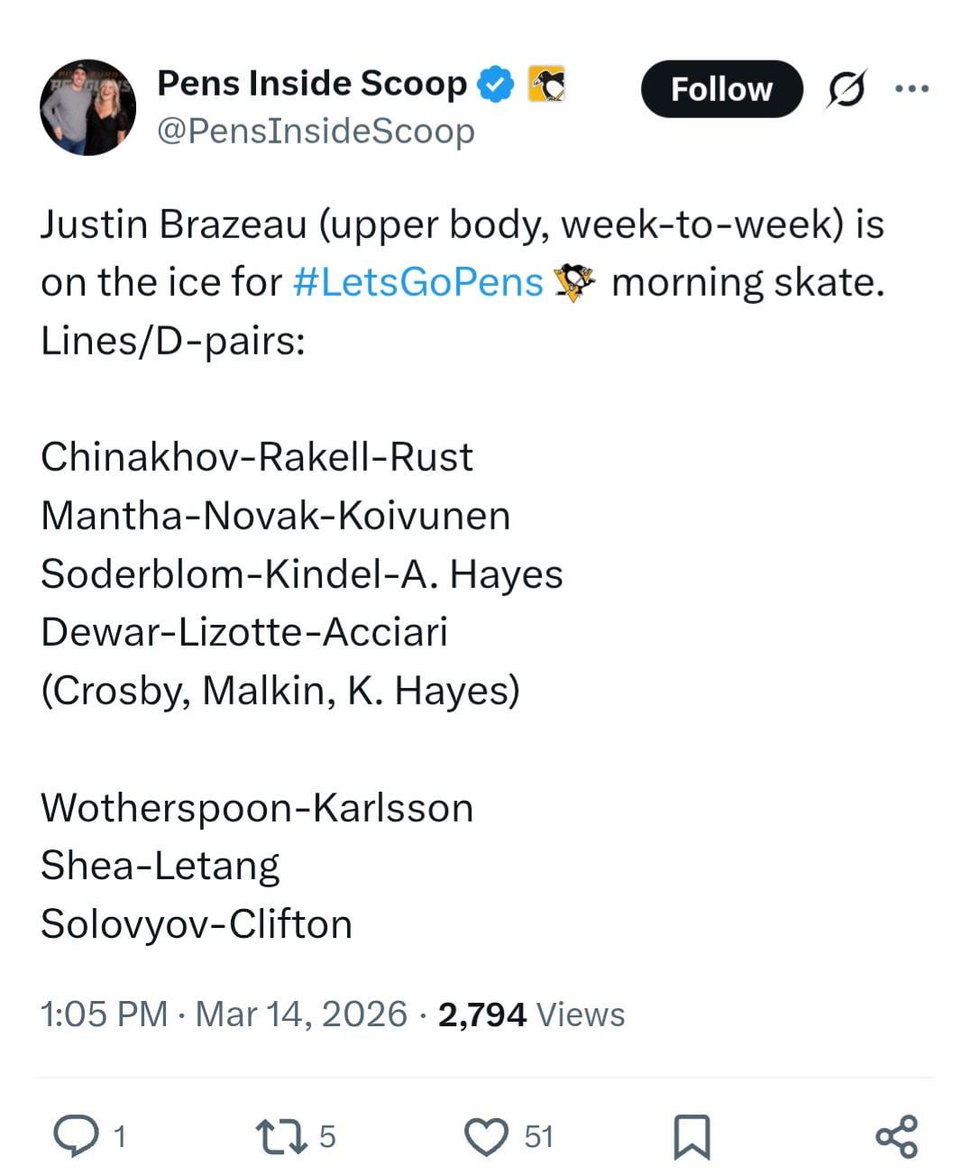I bet Sid comes back Monday with Geno. Especially since they’re facing MacKinnon.