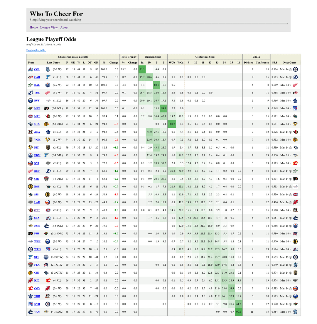 Just have one page that lists the games, and 4 columns each explaining how the Sens playoff odds change with each outcome. So much needless work here. You don’t need to put all the other odds in for other teams cuz that should all be factored into the calc for the Sens. This is a Sens sub, making it more difficult to read Sens info that already implies info for other teams means you don’t need to have a 6 page post just so you can include that info for other teams.