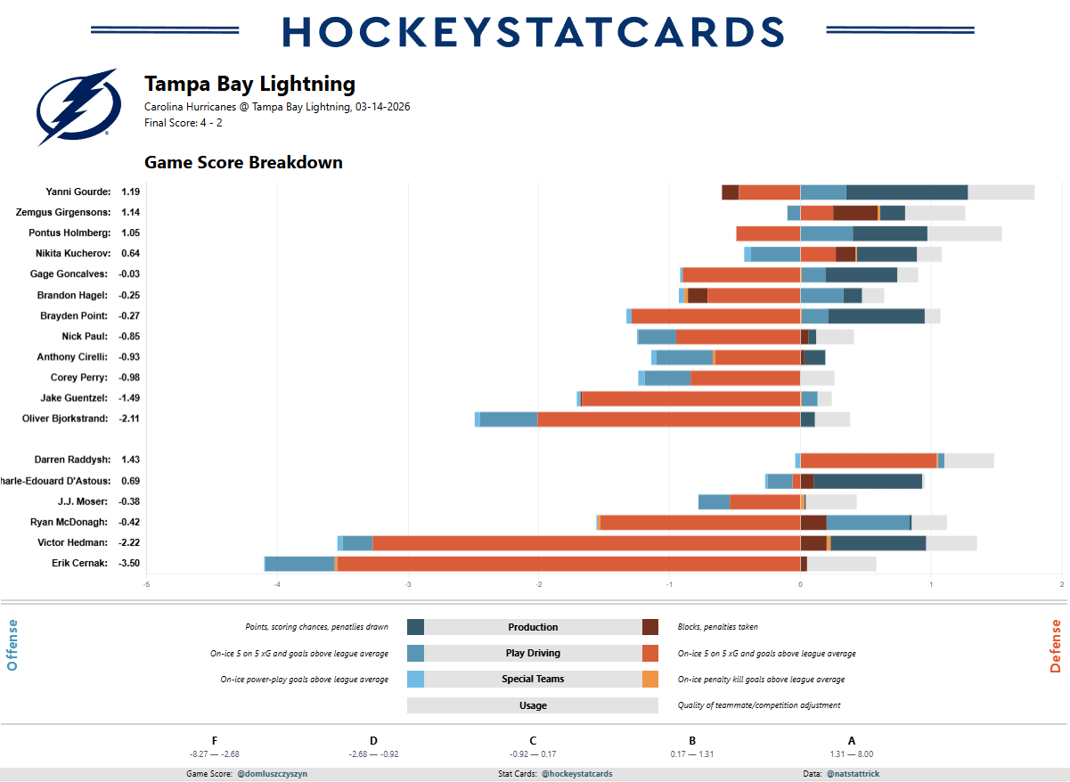 Carte d’impact NHL GameScore pour le Lightning de Tampa Bay le 14/03/2026 :