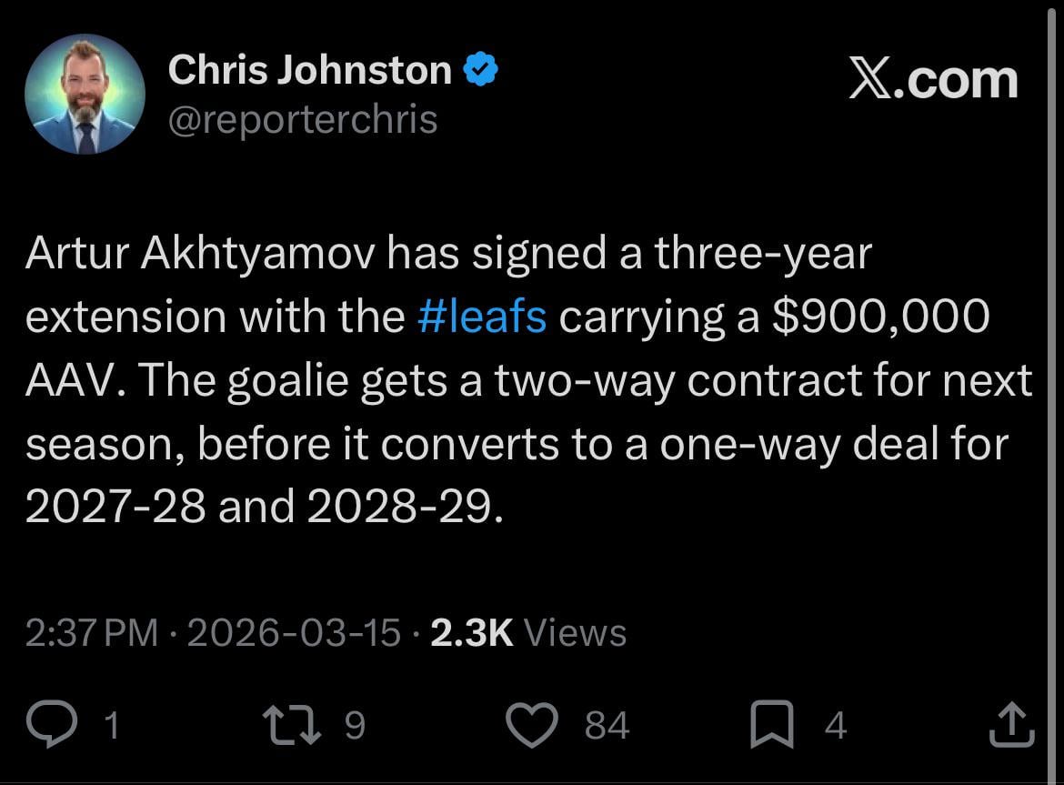 [Johnston] Artur Akhtyamov a signé une prolongation de trois ans avec les Leafs avec un AAV de 900 000 $. Le gardien de but obtient un contrat à double sens pour la saison prochaine, avant de le convertir en un contrat à sens unique pour 2027-28 et 2028-29.